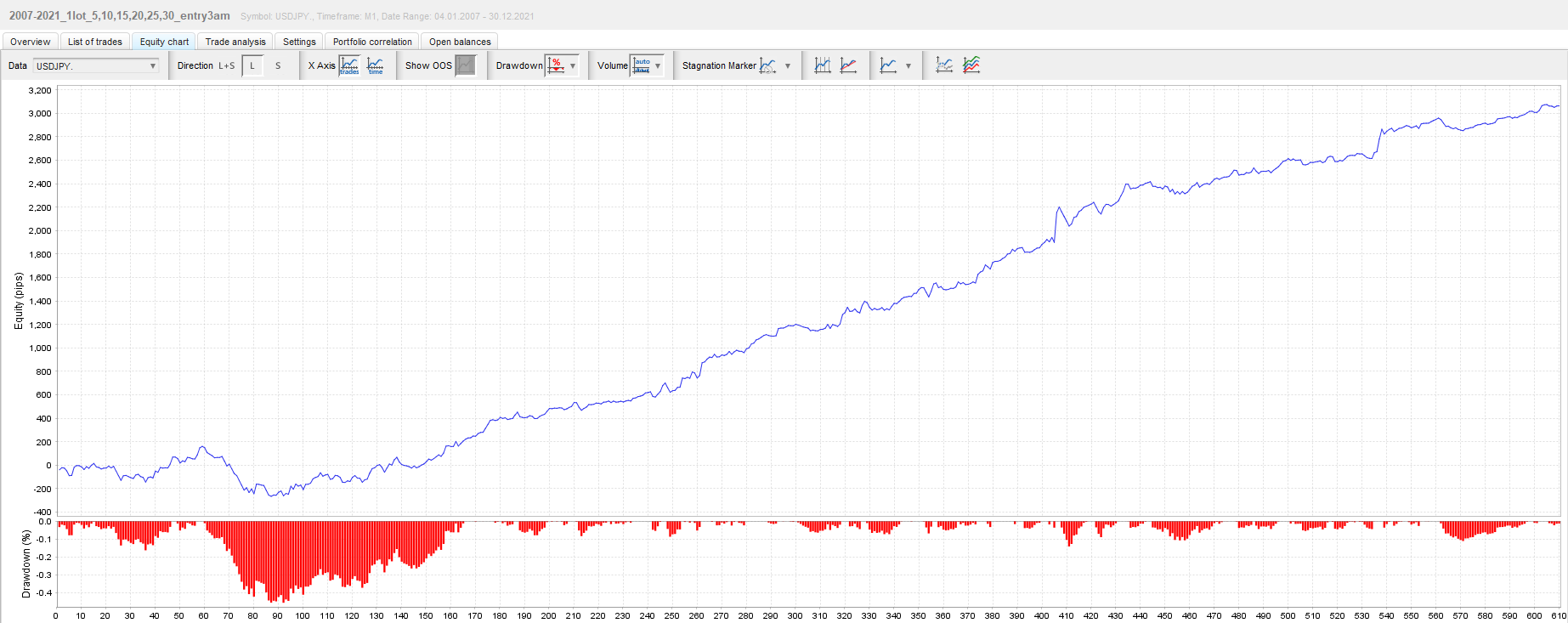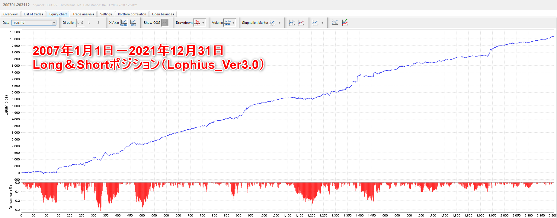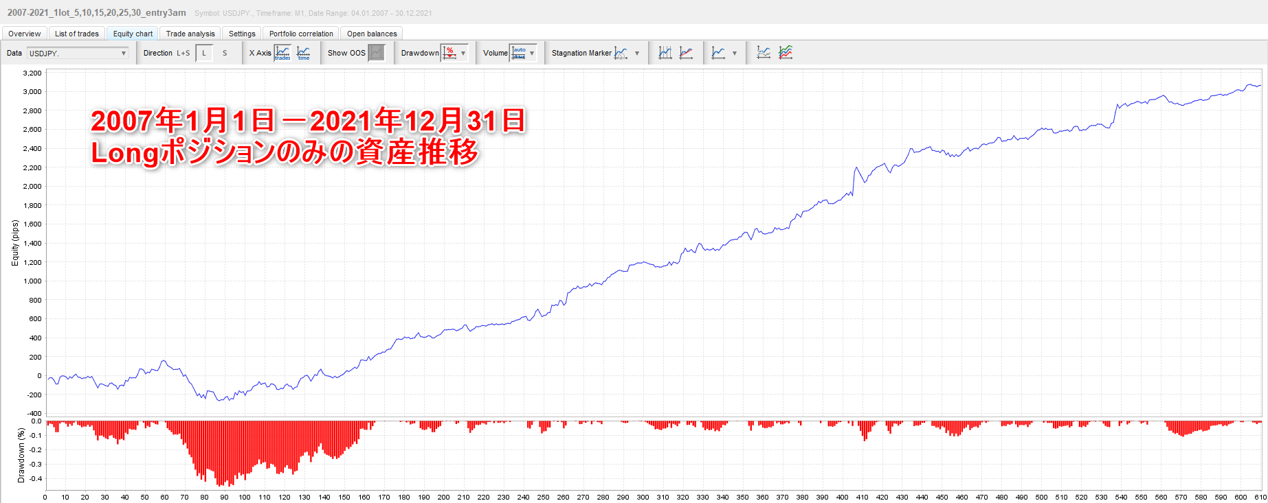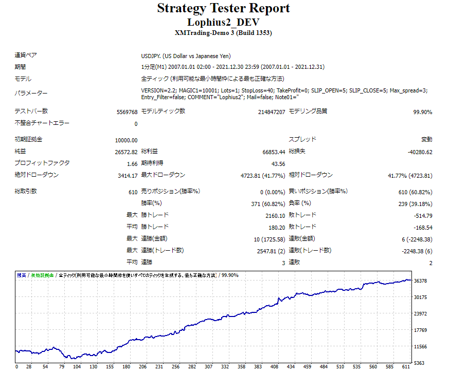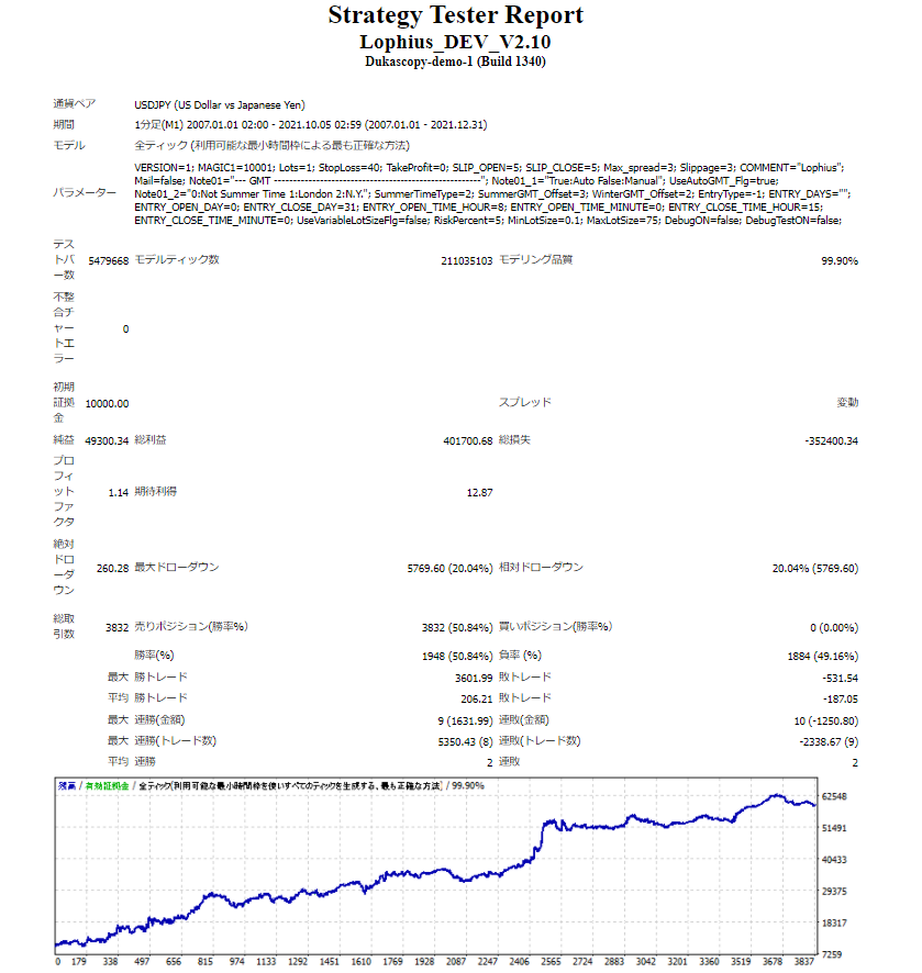 それではこの条件でバックテストを行います。 Lophius(ゴトー日Long)2007/1/1-2021/12/31 バックテスト期間 :2007年1月1日~2021年12月31日 初期資金 :10,000ドル ロット :1ロット固定 純益 :26,572ドル プロフィットファクター :1.66 最大ドローダウン :41.8% 取引回数 :610回 勝率 :60.8% リスクリワード :1:1.1(-168:+180) この結果の中で、一番の懸念点は最大ドローダウンが大きい点です。しかし、運用初期の利益が積み上がっていない状態でのドローダウンであること、また直近12年間の成績が申し分ないことから、一旦許容範囲と判断しました。その上で、既存のロジックと合わせた時にこのドローダウン期間がどのような状況になるのかを検証してみます。 ドローダウン表示を含む資産曲線は以下の通りです。 次にPips換算でのトレード成績を確認します。 2007年から2021年までの各年・各月の獲得Pips一覧表です。 運用初期の2007年、2008年にマイナスがあり、これが最大ドローダウンの値に影響しています。負けた要因の一つとしてはリーマンショックの時期に「ドルのLongポジションを保有するリスク」というのも関係あるかもしれません。 Lophius EAのメインロジックはUSDJPYの実需を捉えたShort戦略にあります。というわけで、従来の月末Short、ゴトー日Shortのロジックとこのゴトー日Longのロジックを合算した場合、どのようになるでしょうか。特に2007・2008年に注目しつつ、確認してみましょう。 Lophius(月末Short+ゴトー日Short+ゴトー日Long)2007/1/1-2021/12/31 バックテスト期間 :2007年1月1日~2021年12月31日 初期資金 :10,000ドル ロット :1ロット固定 純益 :90,678ドル プロフィットファクター :1.67 最大ドローダウン :4.8% 取引回数 :2204回 勝率 :58.5% リスクリワード :1:1.2(-147:+174) 先ほどの2007年・2008年のLongが不利な期間をShortが見事にカバーしています。 念のためLongのみ・Shortのみ・両方の合算をそれぞれ資産曲線で確認してみます。 この時期(2007年-2008年)はLophiusロジックの時間帯においては、 LongよりもShortの方が明らかに優位性が高かったことがわかります。 さらに言えば、その他の期間ではLongとShortの両方に優位性がありますので、これらのロジックを組み合わせることでよりパフォーマンスがあがることは間違いありません。 チャート上の一例ですが、ゴトー日Longのトレードイメージです。 最後に「月末Short」+「ゴトー日Short」+「ゴトー日Long」の3つのロジックを合わせたトレードデータの詳細は下記になります。 懸念点も解消され、引き続き年間を通した負け越しは15年間で0という状態です。 これまでの成績にLongの分が上乗せされました。 実はトレードにおいて「LongとShort、どちらがより得意なのか」という視点を持たずにトータルの成績を分析しようとするトレーダーやEA開発者が多いです。 見落としがちですが大事な観点ですので(しかもシンプル)、ぜひご参考になればと思います。 2025年4月現在において、このロジックで運用を行っています。 EAに価格を付けるのは難しいと感じます。 なぜなら、その価値は人それぞれであり、 さらには運用する資産額によって、 すぐに回収できる人と時間がかかる人が分かれてしまうからです。 今回は、実運用テストを行っている口座を元に、 販売価格について考えました。 2021年11月に1,000,000円でスタートした口座資金は、 2025年4月末現在で3,566,611円となっています。 このEAは、10万円の元手がいきなり100万円になるような 魔法のロジックではありません。 緩やかに着実に、資産を増やして行くためのEAです。 それでも42か月で約+256万円 +256%を超える運用益を得ています。 当然、運用資金が増えていけば 利益もそれに伴い増加しますので、 現実的な視点からすると、 この数字はなかなかのものだと思います。 毎月同じペースというわけではありませんが、 最短2か月、波があったとしても半年以内には という結果が出せる価格設定にしたいと考え、 「Lophius EA」:107,800円(税込)とさせて頂きます。 ご注文・支払いが確定しましたら、【ダウンロードサイト案内PDF】をダウンロードしてください。 PDFに記載のURLからファイルをDLして頂き、MT4にセットアップをお願いいたします。 Windows7以降、CPU:1GHz以上、メモリ:512MB以上 商品の性質上、違法コピーに対するセキュリティとしてご利用される口座番号のご登録をお願いしております。 登録口座にてEAが使用可能となります。口座を変更される場合は、サポートにご連絡いただければ何度でも変更が可能です。 当商品は、著者と同じような利益が出ることを保証するものではありません。信用取引やFXは価格変動リスクを伴い、また証拠金を上回る取引を行うことが ありますので、場合によっては投資額を上回る損失を被る可能性があります。 信用取引やFXには取引業者の売買手数料がかかります。当商品で提供する情報は、投資の知識に関する学習・研究のための情報提供を目的としたもので投資助言を行うものではありません。 どのくらいの金額を運用したら良いでしょう