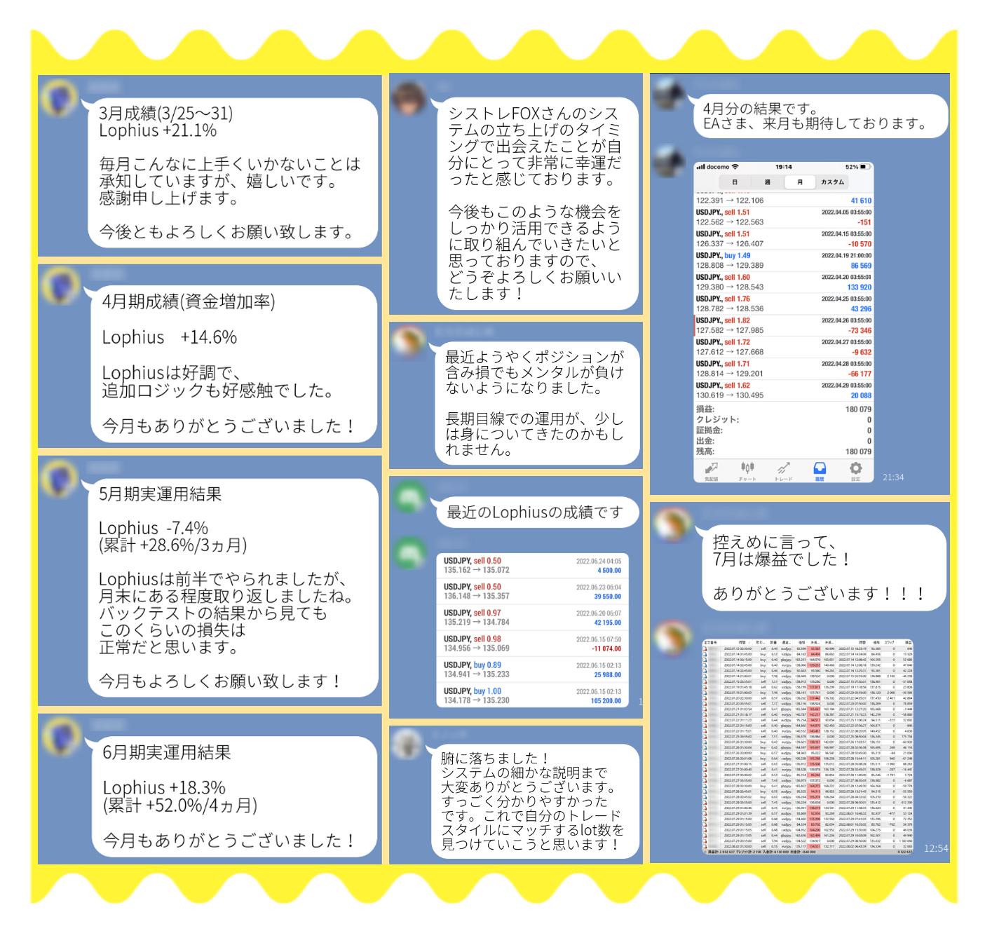 購入者の方々は、 定期的に損益の履歴を送ってくれたり、 トレードについてのより深い質問をされたり、 いい意味でトレードから距離を取れるようになった、 資金が増えたことで「自分は投資をしているんだ!」 という実感がもてた方も多く、嬉しい限りです。 |